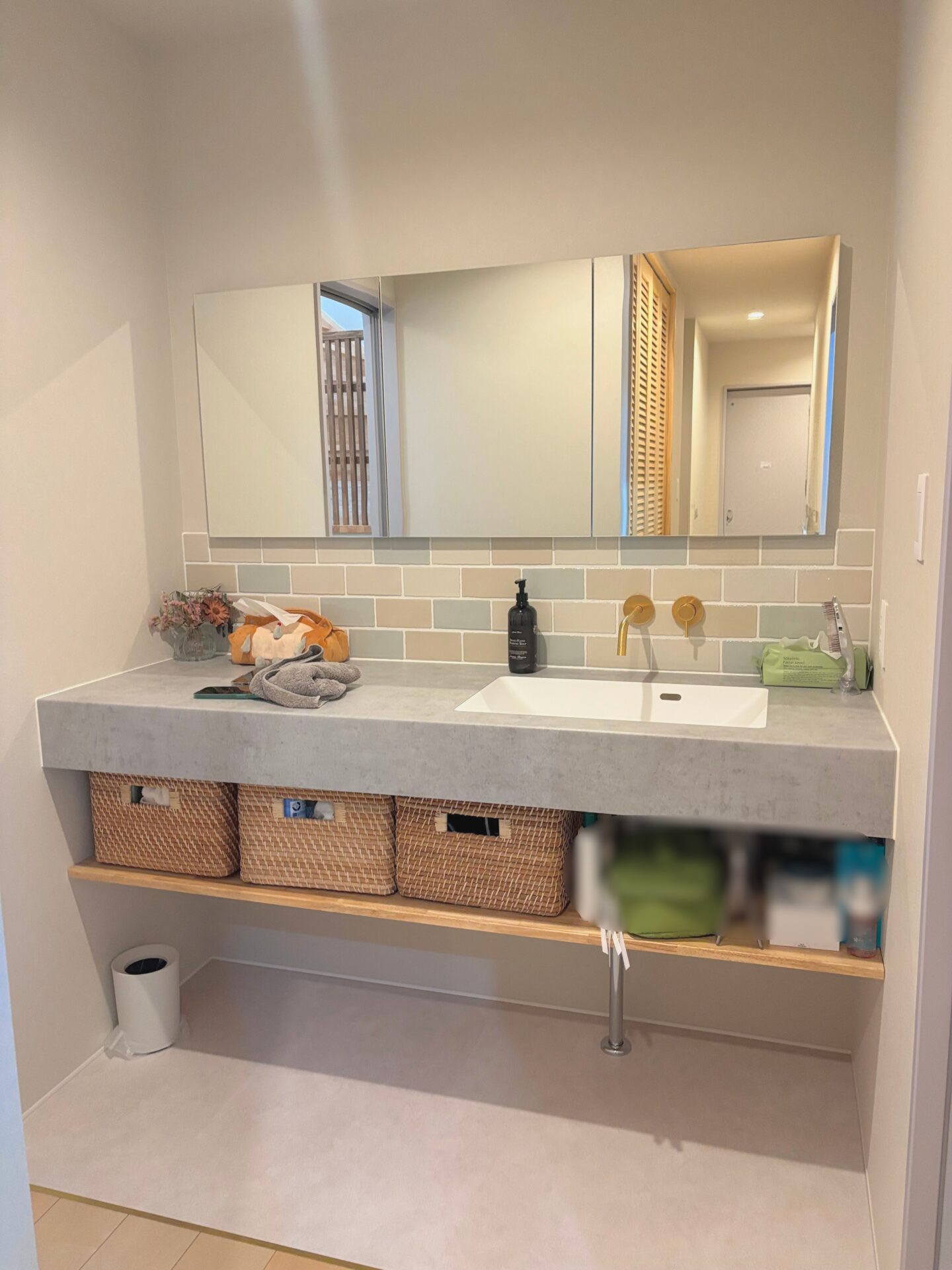 ▼洗面台も造作です。タイルがかわいいですよね。鏡は大きいですし収納力も抜群ですので、デザイン性だけでなく機能性もあります。