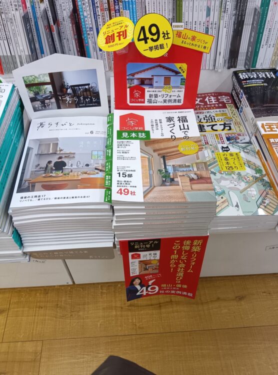 広島県福山市、尾道市、三原市、竹原市、岡山県井原市、笠岡市の書店に置いています。たくさんある住宅会社さんの中から1社しか選べない家づくりです。家づくりを進めていく上で抑えて欲しいポイントがわかるように見本誌も設置しています。決して安い買い物ではありません。2025年4月に省エネ基準が適合義務化されたものの、2030年度には引き上げられる予定です。ご存じですか?建てた後に知らなかった!では遅すぎます。家づくりの最初の第一歩、検討の際にはぜひ手に取ってみてください。