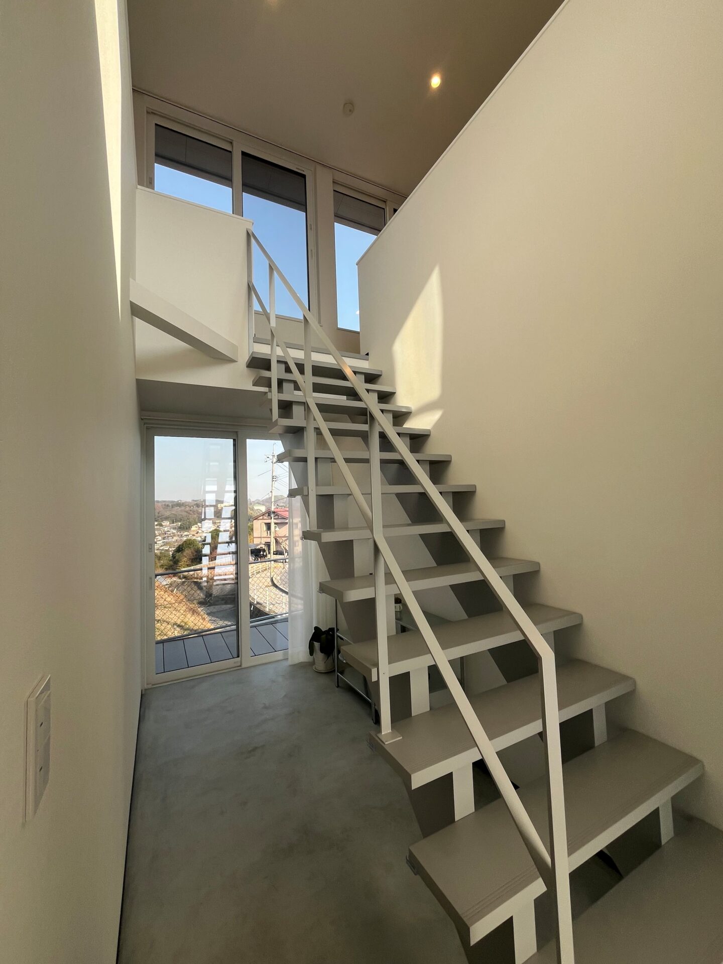 家に入ってすぐ階段のある吹き抜け玄関。広さはそこまでないですが、窓から外に視線が抜けて明るく開放感がありました。
