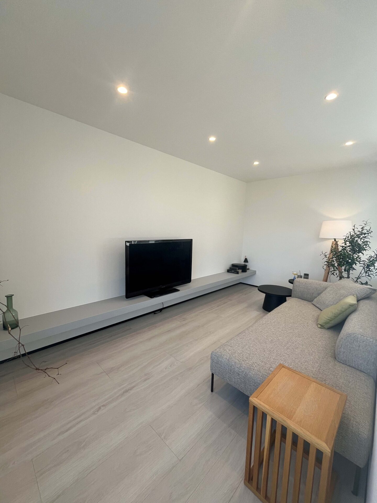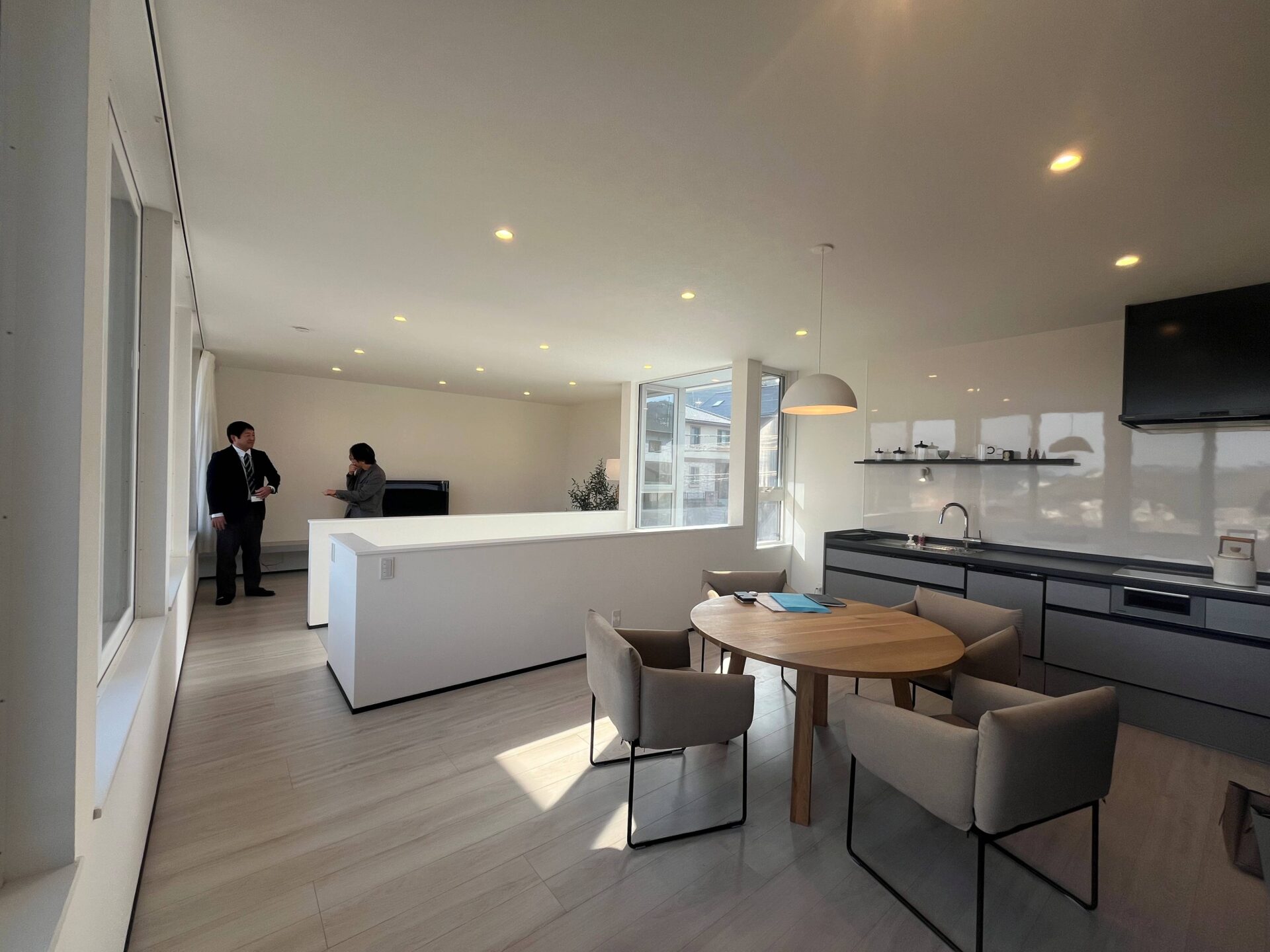 2階のLDK。柱のない広々大空間で、手前がダイニングキッチン、奥がリビングと空間がゆるやかに区切られています。デザインも白やグレー基調で、シンプル・ホテルライクな雰囲気。さんわの家はGX志向型住宅が標準対応で、高気密高断熱のエアコン1台稼働でワンフロア十分な暖かさ✨