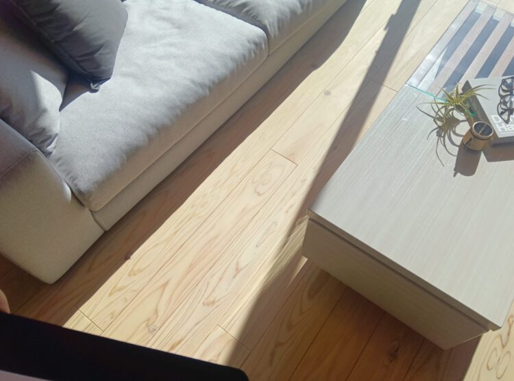 フローリングだと、特に冬は靴下だけで歩くと足がひんやりしますが、無垢材は冷たくない!