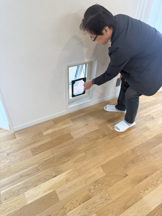 こちらは猫ちゃんとの暮らしを前提に設計された住まい。家の随所に猫ちゃんへの配慮がなされており、快適で居心地の良い空間に仕上がっています。まさに「人にも動物にもやさしい家」ですね。こちらの小窓は大山社長の特注です!!!
