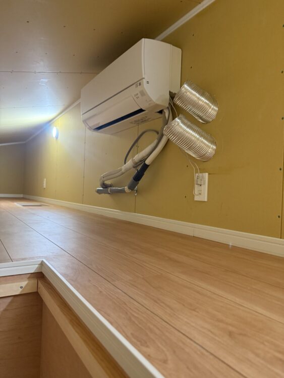性能面でも注目です。なんと!!正真正銘ルームエアコン1台で全館空調を実現しています。夏は小屋裏に設置された8帖用エアコンで涼しさを確保。冬は14帖用の暖房エアコンで家全体を暖めます。各部屋にはガラリを8か所設け、効率的な空気の流れがつくられていました。小屋裏なのに施工がとっても丁寧です。