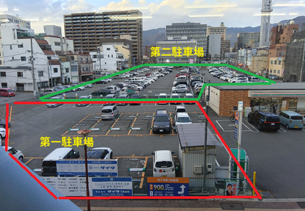 ※写真の囲み内(第一駐車場・第二駐車場)にお車をお停め下さい。家づくり学校をご利用後、お帰りの際にパーキングチケットを進呈させて頂きます。