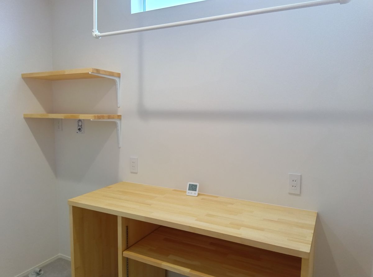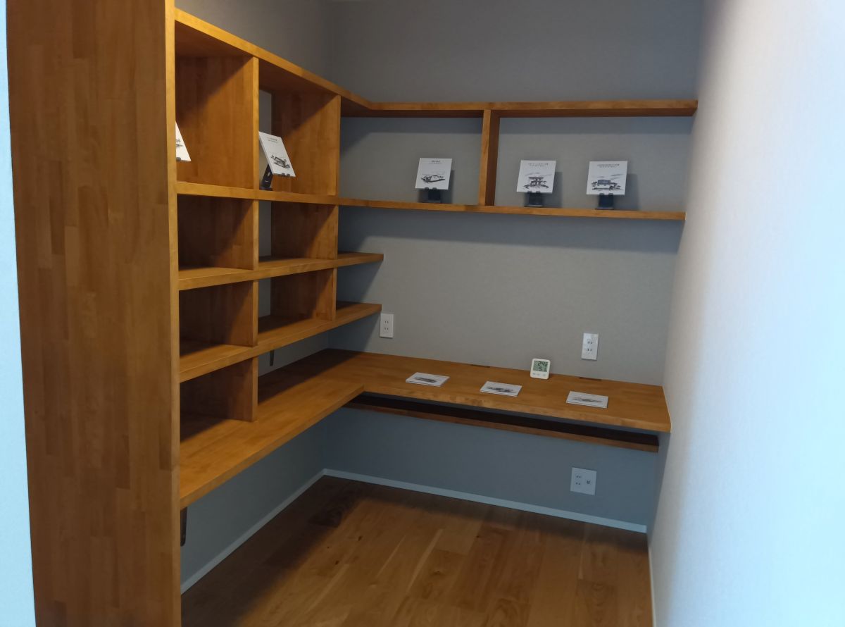 こちらは2階の趣味スペース。あえて扉は付けずに2階もエアコン一台で快適な空間を実現。カウンターにはやっぱり「温度計」。