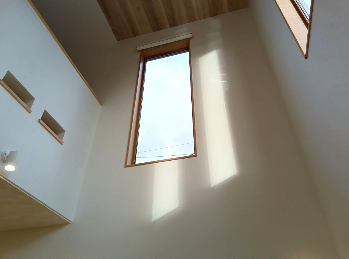 玄関からリビングに入ると開放的な吹き抜けが!家の中からも空を眺められる窓からは、光が降り注ぎ明るい空間となっています。
