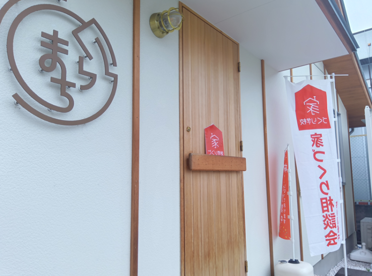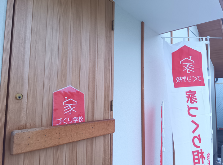 入口に「家づくり学校」のロゴと幟が立っている時が貸し切り運営中の目印!!