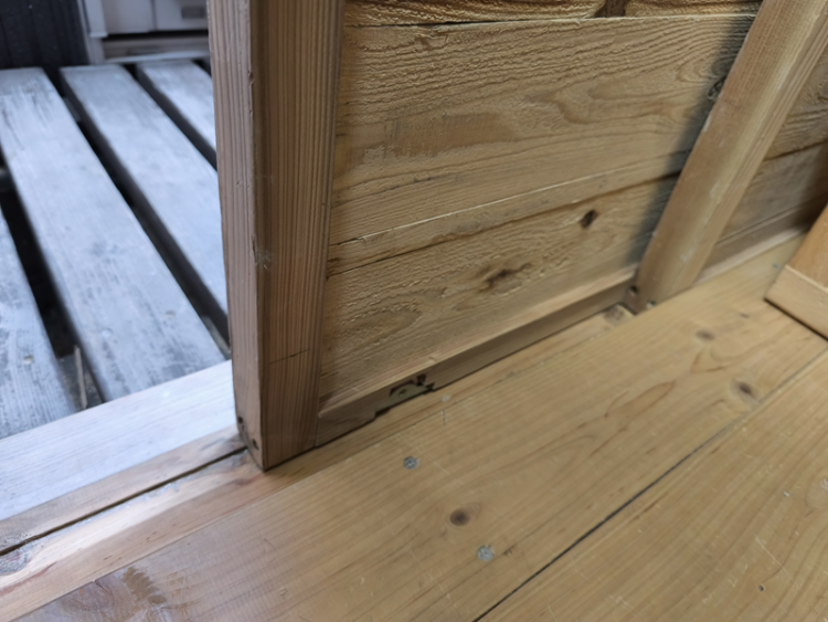 ※当該の引き戸の敷居部分。小屋の内外での色あせ具合からも、経年具合を感じられます。