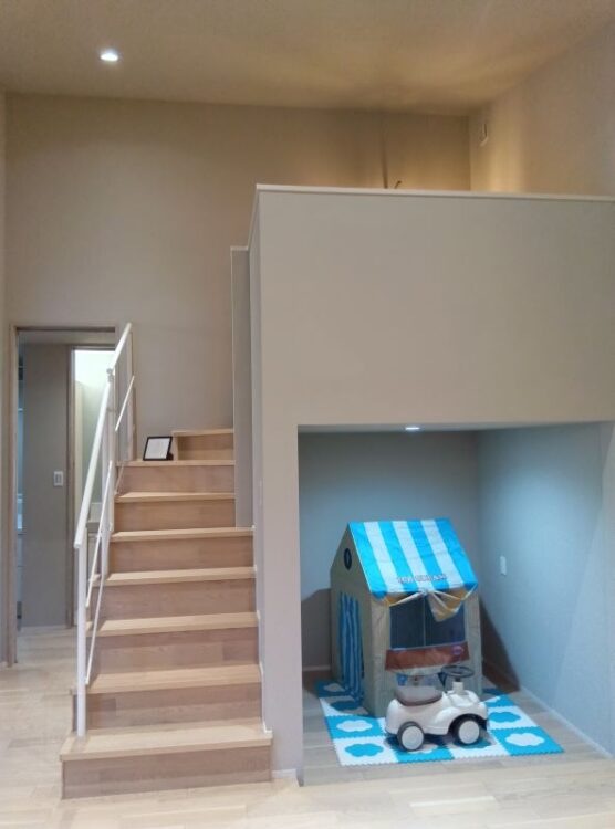リビングの一角に設けられたスキップフロア。隠れ家的なスペースが何ともわくわくしてしまいました。(#^.^#)天井高を下げたスペースで、意外にも頭をあまり下げなくても出入りできてしまいます。もちろん身長にもよるかと思いますが…。お子様の遊び場として、大活躍しそうです。