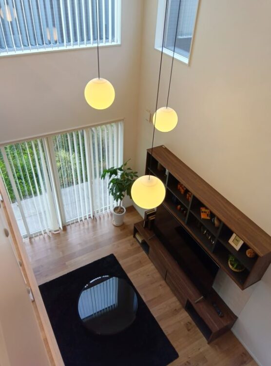 一階からはこんな感じです。✨梁や柱が少なくても、耐震性を重視した大空間が実現できるというのは嬉しいですね。