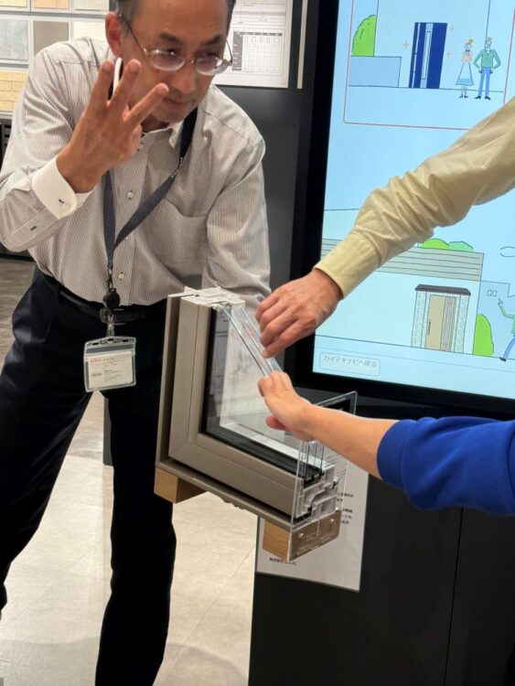 今回は建材について勉強するためにお邪魔させていただきました。こちらのショールームでは、水回りも建材(主は窓やドアといった開口部)も同じ場所で見られるんです。見た目も大事ですが、細かく見るとと~っても奥が深いんです。