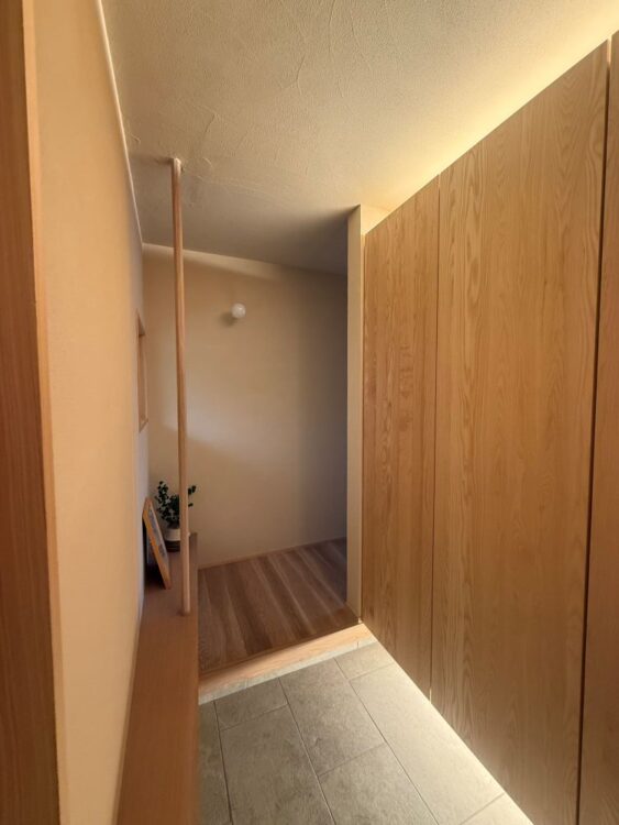 お家に入った瞬間が写真では分からない、空気感が一番よくわかります。木の香りも実際に体感に行って初めて体感できるもの。そしてこちらは左右から上がれる動線と、たっぷりの収納できる造作棚が設けられていました。靴だけではなく、帰ってきてすぐに厚手のコートもかけられます。