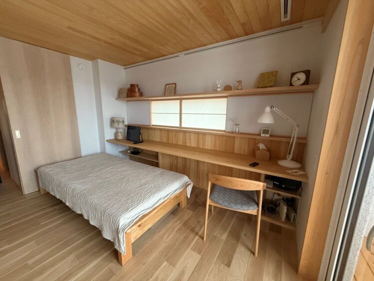 今は1階が寝室としてのお部屋も、将来的に1階ですべて生活できるよう、キッチンにもできるよう準備もしているそう。造作のスタディースペースからは、お庭をめでることもでき、憩いの場所ともなっていてとても素敵です。そうですこちらのお宅は2階がLDKとなっているんです。