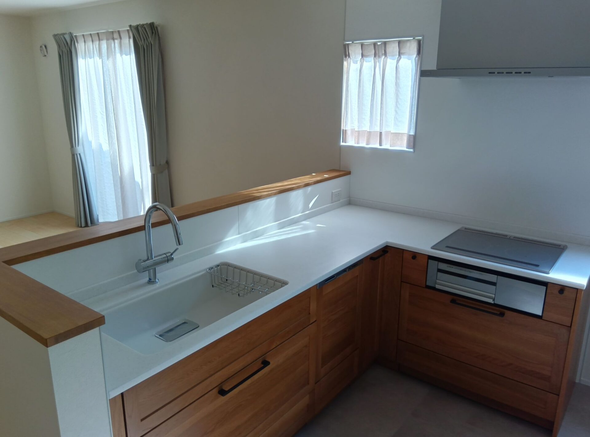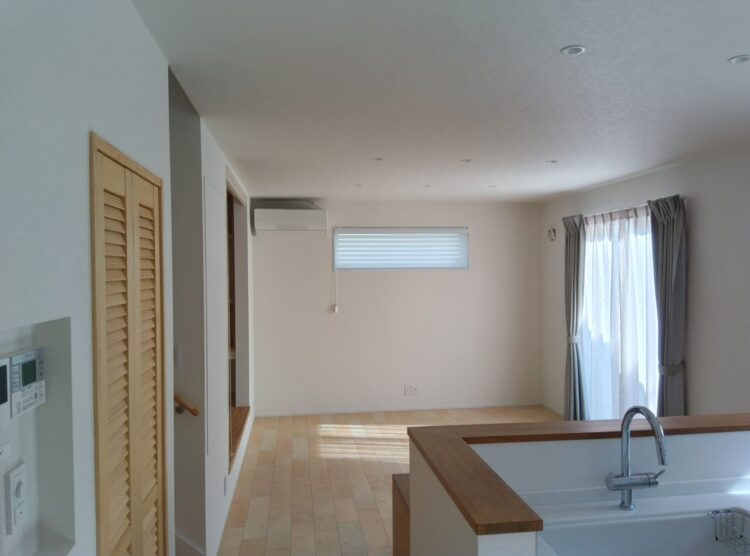 玄関からLDKに入ると、出ましたL字キッチン。私も一人でキッチンに立つなら便利そうだなと思っています。背面に冷蔵庫スペースもあるので、私のように省エネで2歩圏内でちゃっちゃと動きたい人はハマると思いますよ。逆に夫婦で料理するならガツガツ当たりそうで無駄なケンカが発生するかもしれませんが(笑)
