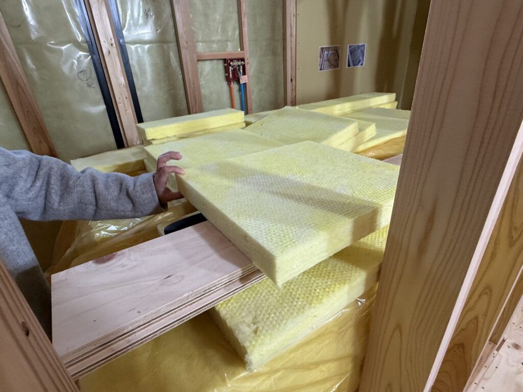 断熱についてですが、今回のお家は、外断熱としてネオマフォーム10cmをぐるっと全面に。内側にはロックウール10㎝に充填にグラスウール4.5㎝を施工。ダンパーはミライエを4基設置。しっかり隅から隅まで隙間が埋まっておりました!!