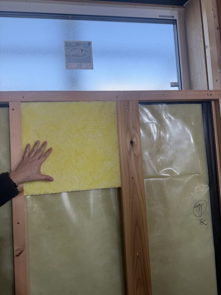 これだけしっかりと断熱入ってると温かいですよね~!他にも見どころがありました。例えばリビングの窓。木製のトリプルサッシを採用してました。取り合いの部分をしっかり計算して設置した窓。家の雰囲気にあった木製の窓、完成時の外観楽しみですね~。