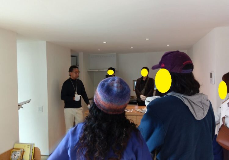 お家の外側の壁はサイディング、というところが多い中、先々のメンテナンスをできるだけ少なくと言ったことを意識した外観についても、違いを知る機会になられたのではないでしょうか。寒さの中でも軒についてのご質問が出るなど熱心に話を聞いておられました。