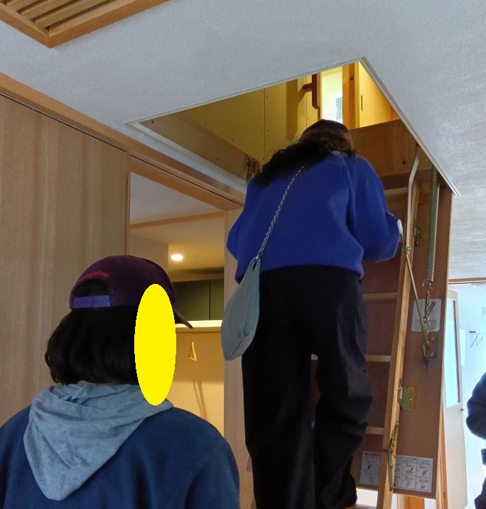 4邸目にお邪魔させていただきましたのは株式会社SANKO様。なんと断熱等級は7に超高気密のモデルハウスです。もちろん暖かく、自然素材のウォールナットの床もすべすべして心地いい♪なんと普通のエアコンが1台でこちらのモデルハウス全体を暖かくしてくれているんです。一方小屋裏には夏使用するエアコンが隠れています。