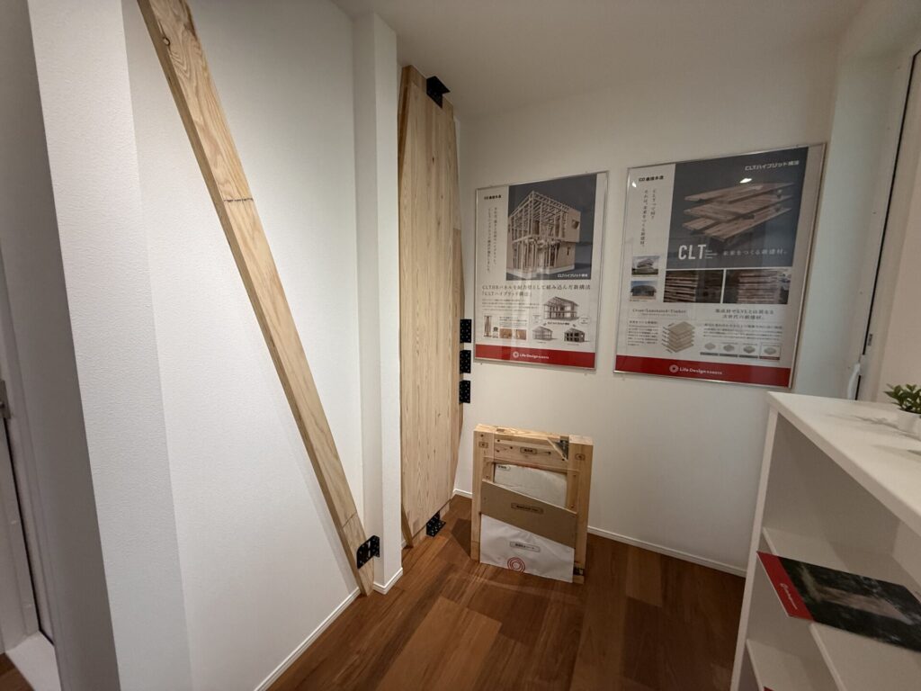 2階にはCLTハイブリット構法の仕組みが学べるスペースがありました。中高層建築で使われる高強度な建材「CLT」を住宅に応用したもので、最高等級の耐震性能と、30帖超の大空間リビングを両立する自由度の高い設計を可能にしています。大きな地震がきても大規模な補修なしで住み続けられる耐久性は、これからの家づくりには必須な要素ですね🤔