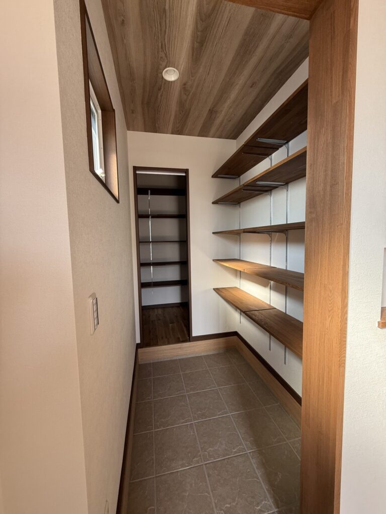 足元のタイルの色や稼働棚、窓枠、天井・・・全部がバランスよく色合いが調和しています。このお家は、UA値0.46、C値0.32、耐震等級3の高性能住宅で、今日は気温が高く外は少し暑かったのですが家の中は温度差なく快適でした^^さて、リビングはどうなの~?
