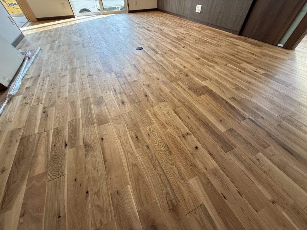 ナラの無垢材が広がって落ち着いた色に酔いしれます♡全体像は次号で・・・