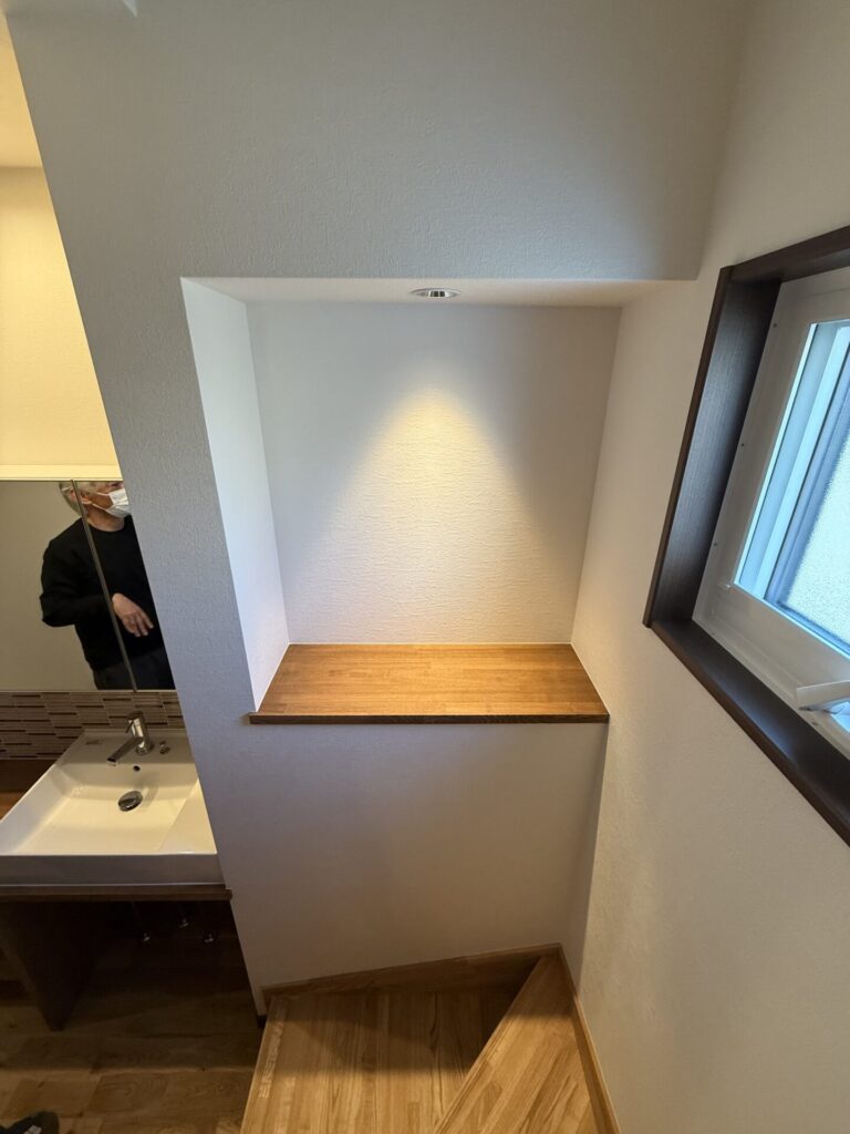 独立洗面台も造作なのですが、奥様が選ばれたタイルが私も好きな色合いで統一感がばっちりでしたね~。水回りの動線もまとまっていて使い勝手の良さをしっかり体感できました。