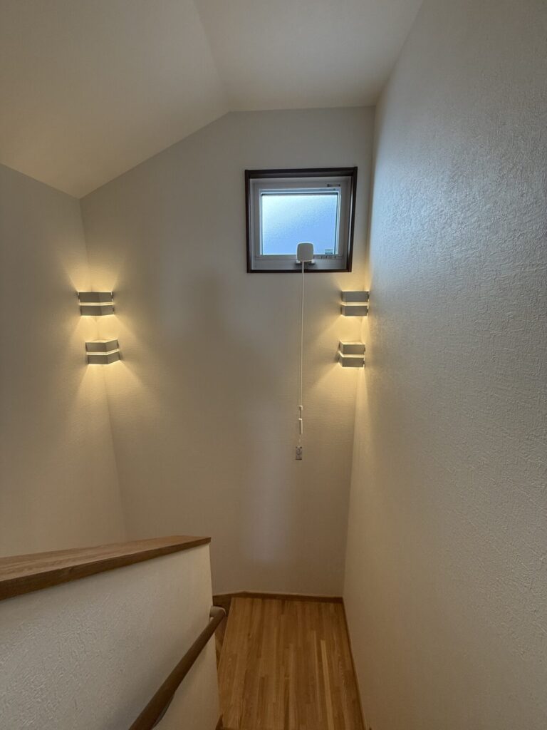 階段の上がり掛けにはちょっとしたニッチがあり、きっとここにはお気に入りの花や雑貨を飾るんだろうなぁ~なんて想像しちゃいました。気持ちにゆとりが生まれますよね、こういうスペース!そしてご主人様こだわりのライト!