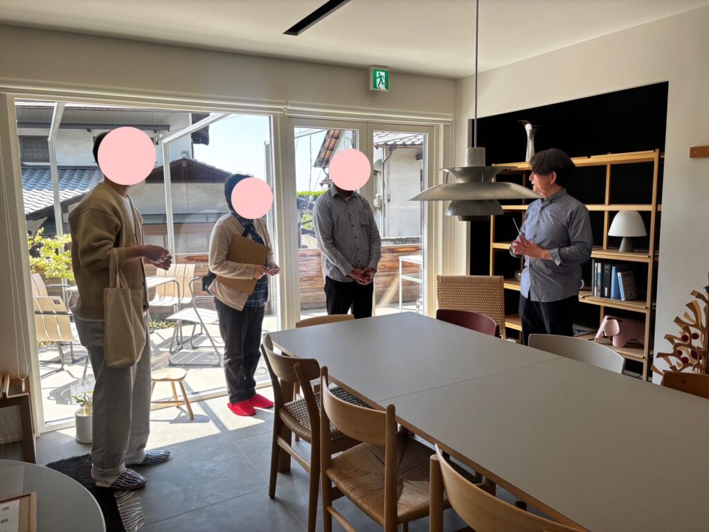 講師をしていただいたのは、アイトフース株式会社の西江社長。日本古来の木造建築の秀逸さと北欧のデザインとの親和性や共通項を見出した家づくりを得意としています。早速モデルハウスにお邪魔して、家づくりを肌で体感!とても暖かい日で外にいると少し暑いくらいでしたが、家の中は窓も開いて心地よい風が感じられ、過ごしやすい気温でした🌞