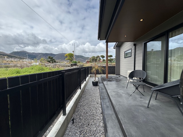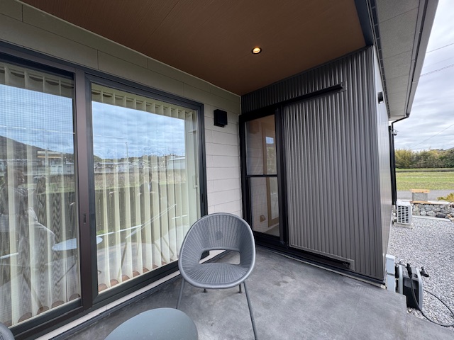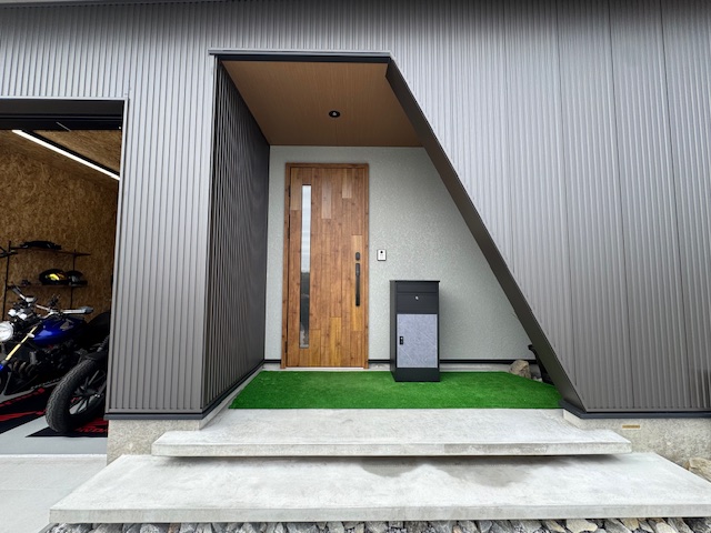 テラスに繋がる勝手口と、玄関に繋がる勝手口でどんなタイミングでも「暮らし方」「遊び方」としての動線も確保!(^^)! テラスも黒に拘り、セメントに特殊な混ぜ物で黒色に…シックなテラスに合わすように外構も焼杉で統一(^^♪