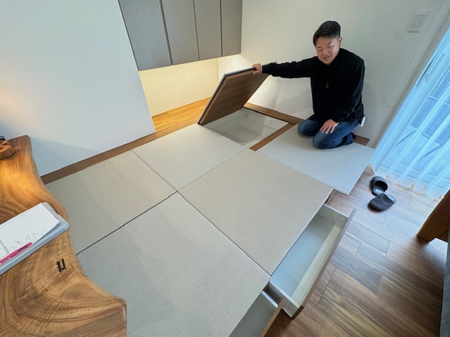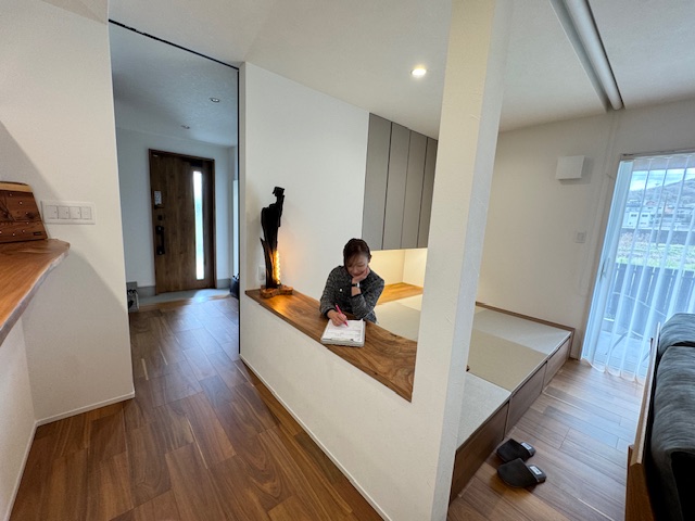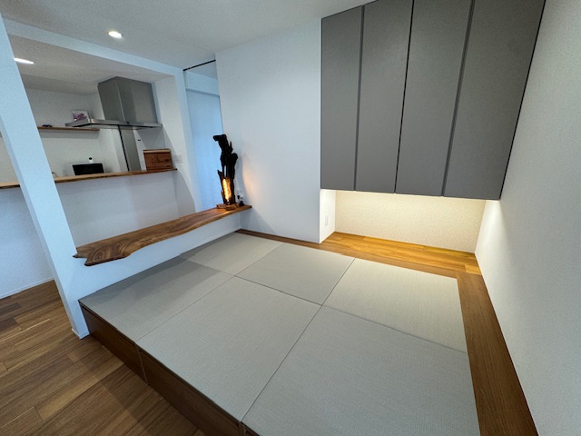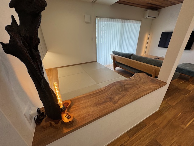 スタイリッシュにまとまった印象の清々しい空間へ♡ 一番に目に飛び込むのは、入って左の造作タタミコーナー(#^.^#) 印象的なのは造作のカウンターテーブル✨ 一枚板の高級感、それでもって不揃いの形から生まれるリズム感のある天板✨ その上には…でましたウッドアーティストの作品★