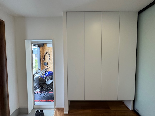 玄関に入ると左から明るい外の光が差し込むガラス扉。そこはガレージに繋がるワクワクの扉となる(^_-)-☆ 玄関からLDKに入るには半透明の引き戸がスタイリッシュにお出迎え。その奥には温かみを感じながら空間演出は…