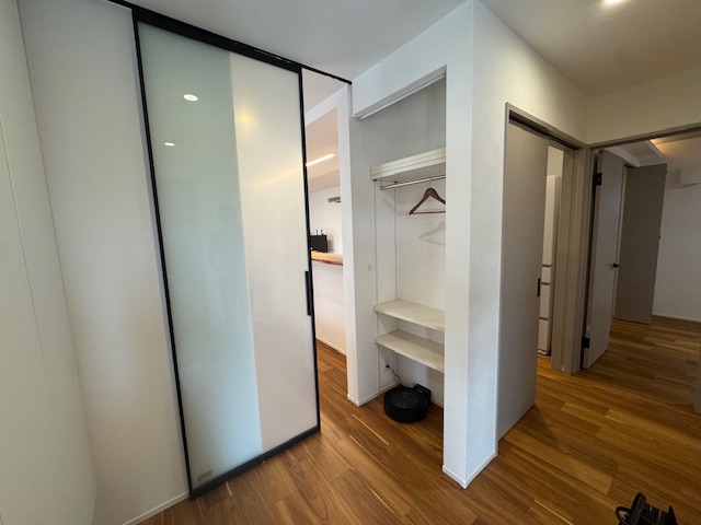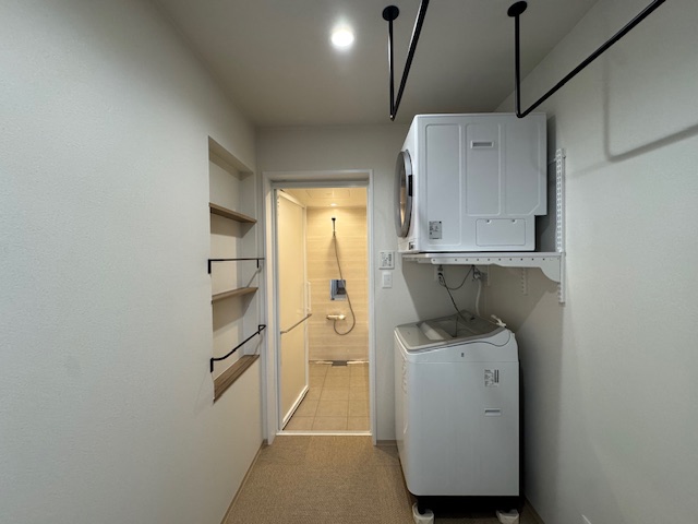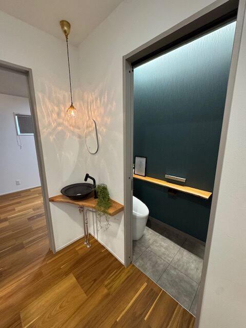 北面には水回りから繋がる主寝室~からの流れるような完璧な動線が… トイレは何と言っても、おこもり空間抜群の印象✨ シックなトーンは落ち着いていても証明計画で中に閉じこもってもそこまで暗くないですよ(笑)💦 トイレから出たら、陶器の手洗い洗面が可愛らしくお出迎え♪ ミラーやダウンライトの配置もありコーナーの演出が憎いぐらいお洒落!