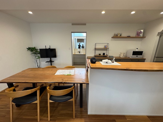 ・LDKの奥にはこれまた造作のテーブルが印象的な空間✨ ソファーもオーダーで作るなどオンリーワンな空間が広がります( *´艸`)❤ 色味にも拘ったソファーはレッドオークの無垢材によるもの… 座り心地は抜群!家具やさんが気になる方はトウマさんまで(笑)!