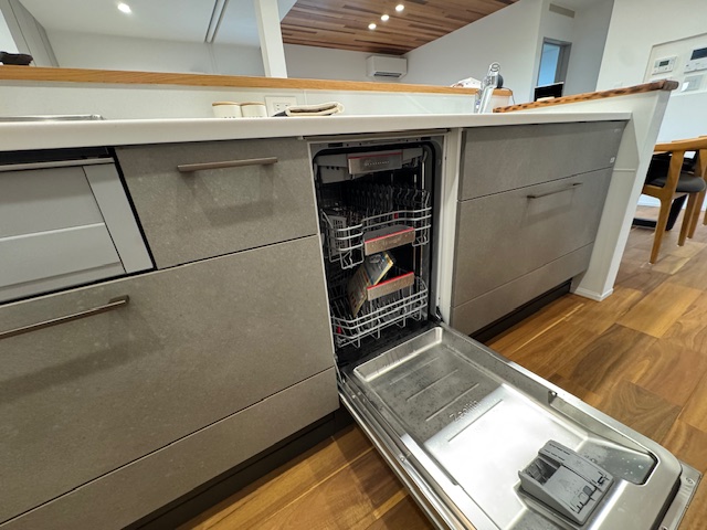 キッチンはタカラさん。こだわりはやはりホーローですよ❣ こちらはご存じだと思いますがやはり家事楽、コスパ・タイパを求める方には持ってこい! 今回はミーレの食洗器45㎝の幅のが設置! 45㎝でもさすがミーレと言わんばかりの収納力! また全体的にグレーの扉も床の色味と相まってスタイリッシュな印象を受けます✨ 背面のカップボート合わせてとてもスタイリッシュ! また正面には海鵜的なテラスと大きな窓!お料理するのも楽しくなりそう❣