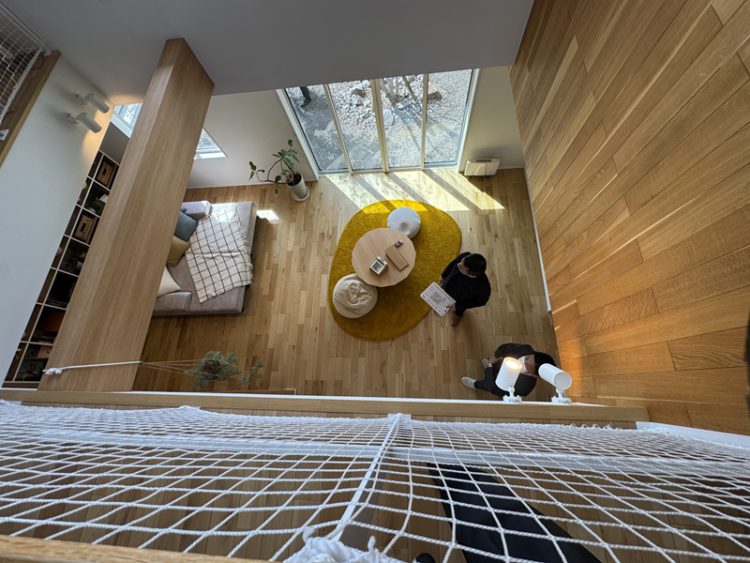 ※大開口のリビング吹き抜け空間。冬でも冷気が降りてくることなく、あたたかなリビングとなります。